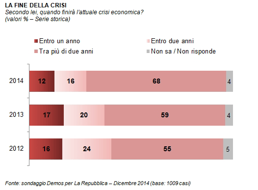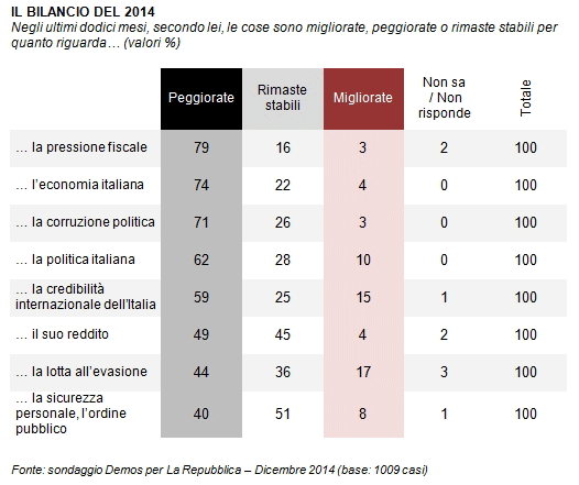 Dall’indagine Demos 2014 emerge una nazione spaesata sfiancata da crisi, fisco e corruzione. Il quadro già negativo del 2013 peggiora ancora. Anche la magistratura in calo