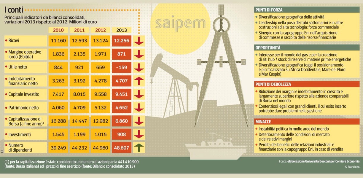 «Saipem fa parte del gruppo Eni ma opera anche per i suoi concorrenti — nota Stefano Caselli, prorettore dell’Università Bocconi, che per Corriere Economia ha analizzato i bilanci dell’azienda —. Il piano industriale dell’Eni, con la gestione post-Scaroni, gruppo. Prima della vendita va risolto questo aspetto che avrà ripercussioni sul conto economico Saipem, per l’aumento degli oneri finanziari».