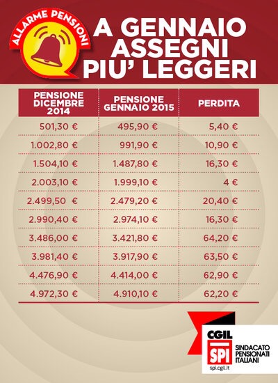 In questo modo una pensione minima perderà 5,40 euro rispetto a dicembre 2014 mentre una pensione da 1.500 euro perderà 16,30 euro.