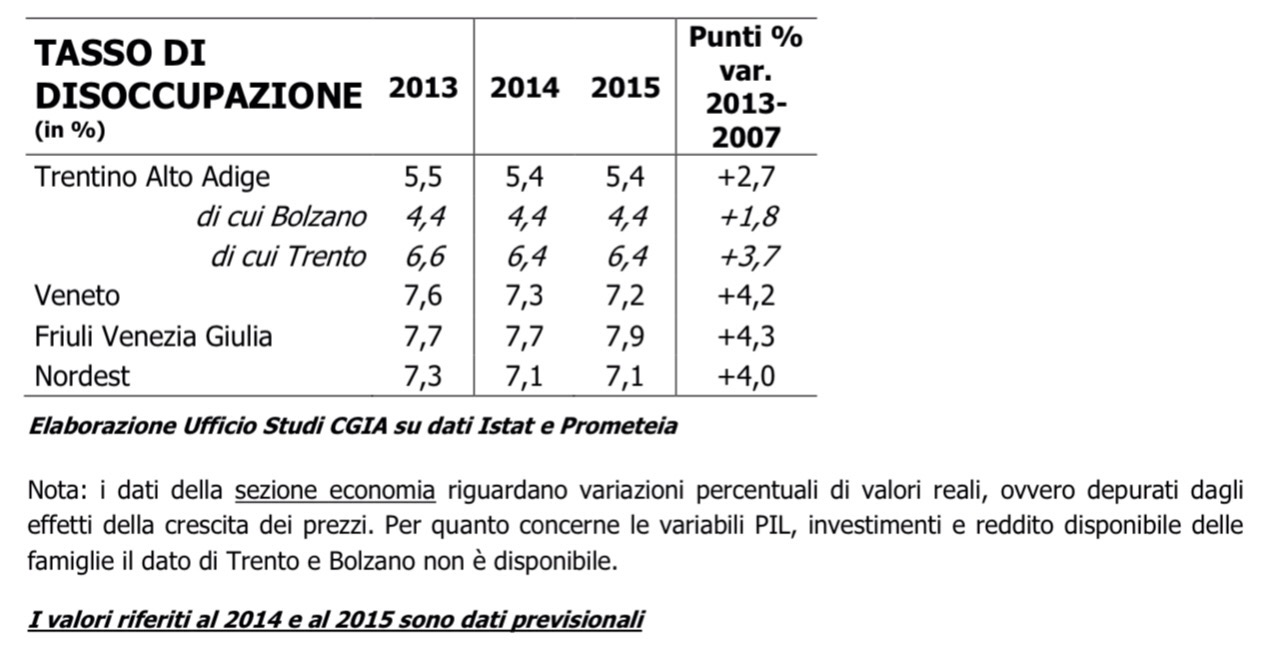 Il tasso di disoccupazione, infine, dovrebbe eguagliare il dato raggiunto nel 2014: 7,1 per cento. Se a Bolzano il tasso rimarrà al 4,4 per cento, a Trento si fermerà al 6,4 per cento, mentre nel Veneto scenderà al 7,2 per cento. Solo nel Friuli Venezia Giulia la disoccupazione è destinata a salire al 7,9 per cento.