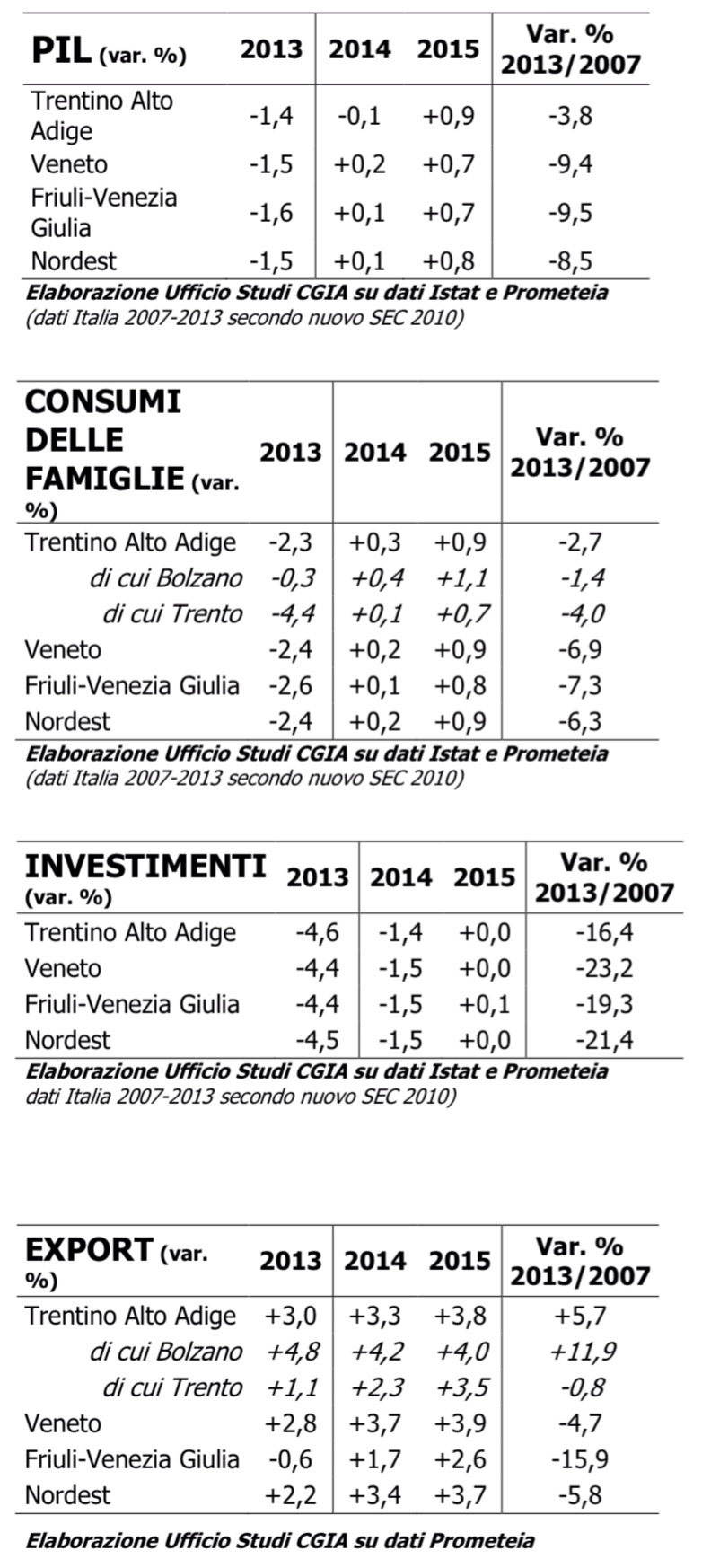 Chi invece ha superato da tempo la fase più critica è l’export: dopo il + 3,4 per cento del 2014, nel 2015 l’aumento dovrebbe essere del +3,7 per cento, con un livello record del 4 per cento a Bolzano, seguito dal 3,9 per cento del Veneto, dal 3,5 per cento di Trento e dal +2,6 per cento del Friuli Venezia Giulia.