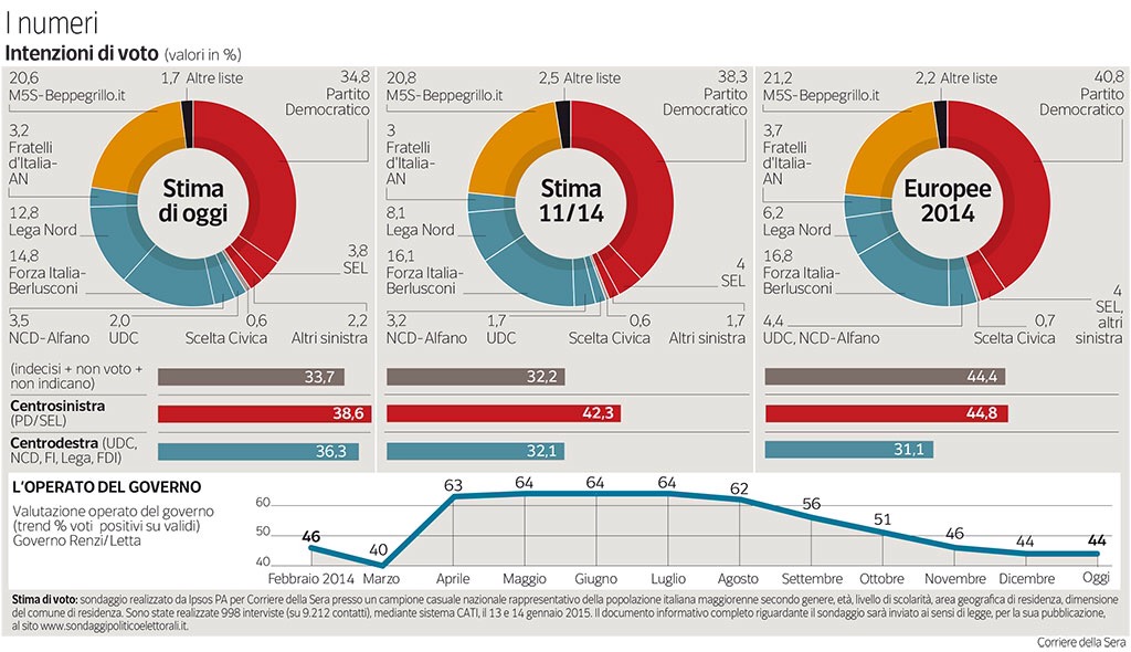 E il governo? La flessione di consenso registrata tra settembre e dicembre sembra essersi stabilizzata. Le vicende avvenute a cavallo del nuovo anno non hanno inciso particolarmente: il clamore suscitato dal decreto fiscale e dal sospetto di aver voluto favorire Berlusconi non ha penalizzato l’esecutivo e l’attentato parigino sebbene abbia suscitato grande emozione nel nostro Paese non ha determinato la crescita di consenso per il governo e per le istituzioni che solitamente accompagna gli eventi drammatici. In questi mesi è la crisi economica a guidare le opinioni. L’inversione di tendenza nella popolarità del governo dipenderà più dall’andamento dell’economia che dalle pur auspicate riforme istituzionali o dalla scelta del nuovo presidente della Repubblica.