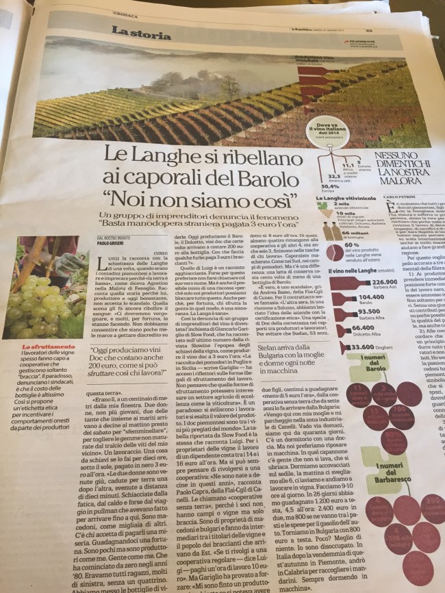 Quello di Luigi è un racconto agghiacciante. Forse per questo preferisce non farsi chiamare col suo vero nome. Ma è anche il possibile inizio di una riscossa “perché solo noi produttori possiamo bloccare tutto questo. Anche perché, per fortuna, chi sfrutta la gente in quel modo, è una minoranza. La Langa è sana”.