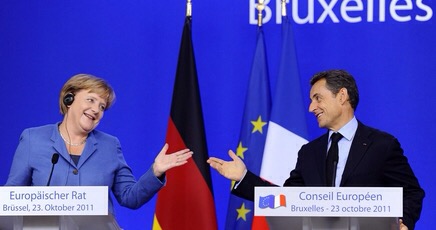 Uno sguardo reciproco di intesa e due larghi sorrisi, che scatenano le risate della sala: così il cancelliere tedesco Angela Merkel e il presidente francese Nicolas Sarkozy reagiscono a una domanda sull’Italia e le riforme nella conferenza stampa dopo il Consiglio Europeo.