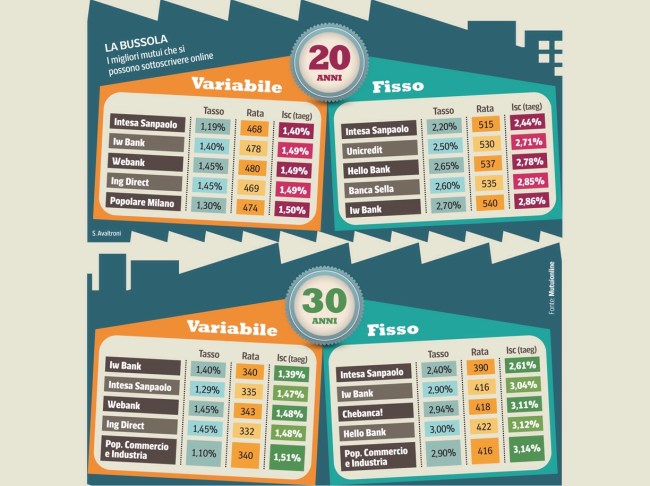I finanziamenti fissi peraltro devono confrontarsi con i variabili anche loro ai minimi storici: dalla ricognizione di mercato che presentiamo in tabella emerge che l’offerta migliore a 2 anni è addirittura all’1,19%, un livello che per la Svizzera è normale ma che in Italia non si è mai visto. Su un mutuo a 20 anni da 100mila euro significa pagare 468 euro al mese a fronte dei 515 necessari per il finanziamento fisso. I 47 euro di differenza salgono a 50 se si effettua il confronto sul finanziamento trentennale. La forbice tra indicizzato è fisso si è ristretta a un solo punto percentuale, mentre non bisogna tornare molto indietro nel tempo per trovare differenze oltre il 2 per cento.
