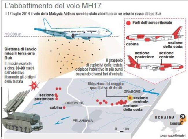 Infine, sempre dalla relazione del Ovv emerge che il missile, il Buk, ha colpito l’aereo in modo frontale, colpendo per prima la cabina di pilotaggio, per poi distruggere il resto della carlinga. Verrebbe così respinta dagli esperti la teoria russa secondo cui questo sia partito dalle aree controllate dall’esercito ucraino.