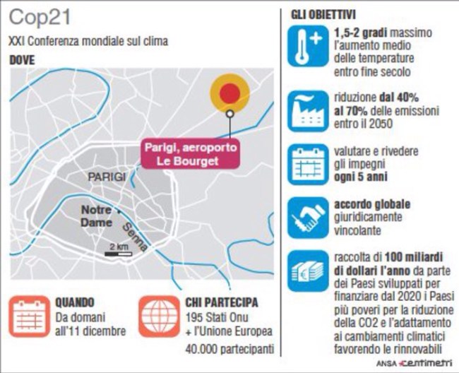 Abbiamo bisogno di un accordo significativo e forte qui a Parigi” sul clima per stare “sotto i due gradi” di aumento della temperatura, anche per garantire “la pace e la sicurezza internazionale”, ha spiegato il segretario generale dell’Onu Ban Ki-moon all’apertura dei lavori.