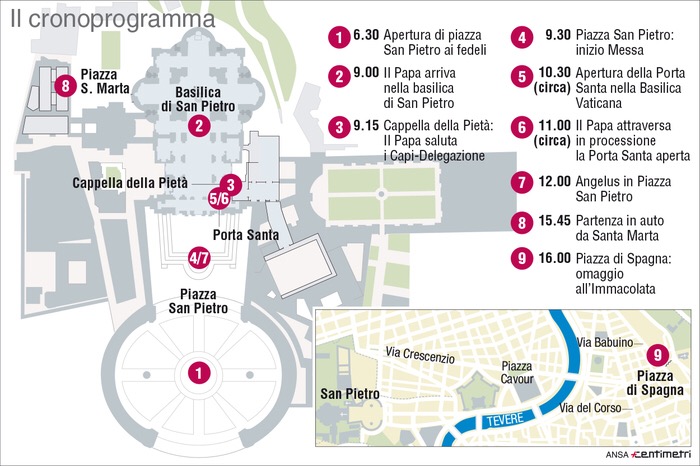 Aperti all’alba i varchi d’accesso all’area ‘blindata’ di San Pietro; dopo la messa papa Francesco aprirà la Porta santa, poi l’angelus e nel pomeriggio l’omaggio di Bergoglio alla statua dell’Immacolata a piazza di Spagna. Dalle 7 alle 19 no-fly zone in un raggio di 10 km; in campo 2.000 uomini delle forze dell’ordine e 900 vigili urbani; vietato trasportare carburanti dentro il Gra.