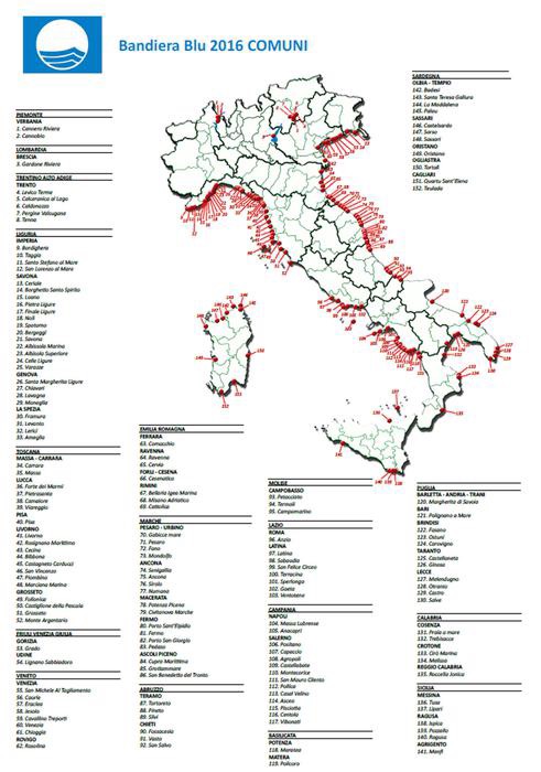 Ancora, la Calabria arriva a 5 bandiere con un nuovo ingresso (Praia a Mare), il Molise conferma le 3 bandiere dell’anno scorso e il Friuli Venezia Giulia le 2 del 2015. La Basilicata raddoppia e grazie all’ingresso di Policoro arriva a 2.