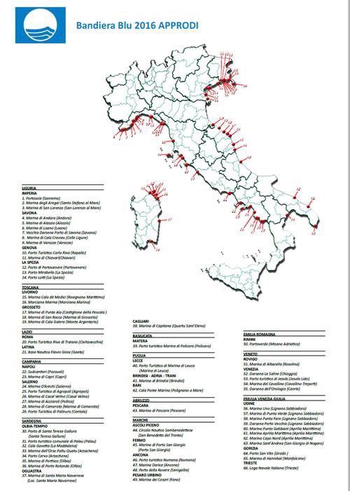 Quest’anno vengono poi riconfermate le bandiere 2015 per i laghi: 1 per la Lombardia, 2 per il Piemonte e 5 per il Trentino Alto Adige mentre per i porti salgono a 66 aggiungendosi Marina di Capitana (Quartu Sant’Elena) in provincia di Cagliari.