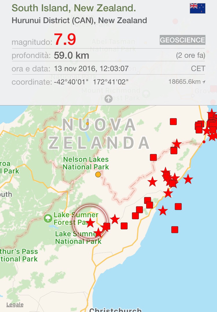 La scossa è di magnitudo 8.1 secondo i calcoli dell’Ingv, 7.9 secondo le reti giapponesi, ben più forte di quanto segnalato inizialmente a 7.4. Sentito dalle reti sismiche di tutto il mondo, è localizzato nella South Island della Nuova Zelanda. L’epicentro è in terra, ma data la grandezza della faglia attivata il terremoto ha dislocato il fondale oceanico con la generazione di uno tsunami. Calcolata un’onda di circa due metri, ha spiegato il sismologo dell’Ingv Alessandro Amato. Il Centro Allerta Tsunami (CAT) dell’INGV, che opera istituzionalmente per i terremoti del Mediterraneo ma che effettua anche il monitoraggio a scala globale, ha determinato per questo evento un magnitudo di poco superiore a 8. Gli altri centri di monitoraggio terremoti e tsunami al momento forniscono valori di poco inferiori a 8. Tutti i principali centri di allerta tsunami hanno emanato un’allerta per la Nuova Zelanda. I primi dati dei mareografi sulla costa pacifica dell’isola indicano dei forti disturbi del livello del mare, come ad esempio a Kaikoura , con valori di più o meno 2 metri.
