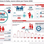 La popolazione italiana al 1° gennaio 2017 ammonta a 60 milioni 579 mila residenti, 86 mila unità in meno rispetto all’anno precedente (-1,4 per mille). La natalità si conferma in calo costante: il livello minimo delle nascite del 2015, pari a 486 mila, è superato da quello del 2016 con 474 mila.